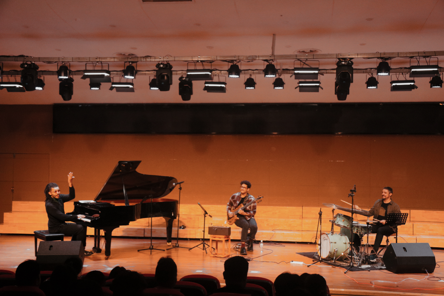 为丰富校园文化,巴西HII Trio乐队受邀于10月28日14:00在贵阳学院音乐厅成功举办了“音越重洋”交流音乐会。音乐会汇聚了贵阳学院音乐学院师生,并特别邀请了贵州盛华职业学院盲人音乐学院的师生代表参加。乐队演绎了热情的巴西桑巴、波萨诺瓦等风格的原创曲目,并对我院老师原创的贵州风格爵士乐《踩鼓舞》《十日如归》进行了创意改编,实现了巴西节奏与贵州风情的巧妙融合,这种音乐上的互鉴为观众带来了独特的视听体验。