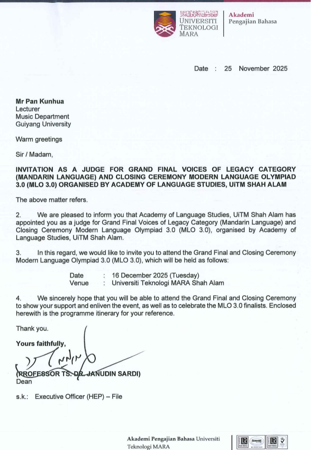2025年12月16日,马来西亚玛拉工艺大学(Universiti Teknologi MARA, UiTM)莎阿南校区隆重举办“现代语言奥林匹克大赛3.0”(Modern Language Olympiad 3.0)总决赛暨闭幕式。受大赛主办方玛拉工艺大学语言研究学院的正式邀请,我院音乐学院潘坤华老师荣幸担任大赛“经典之声”(Voices of Legacy)类别中文歌曲组总决赛评委,并出席了盛大的闭幕式及颁奖典礼。